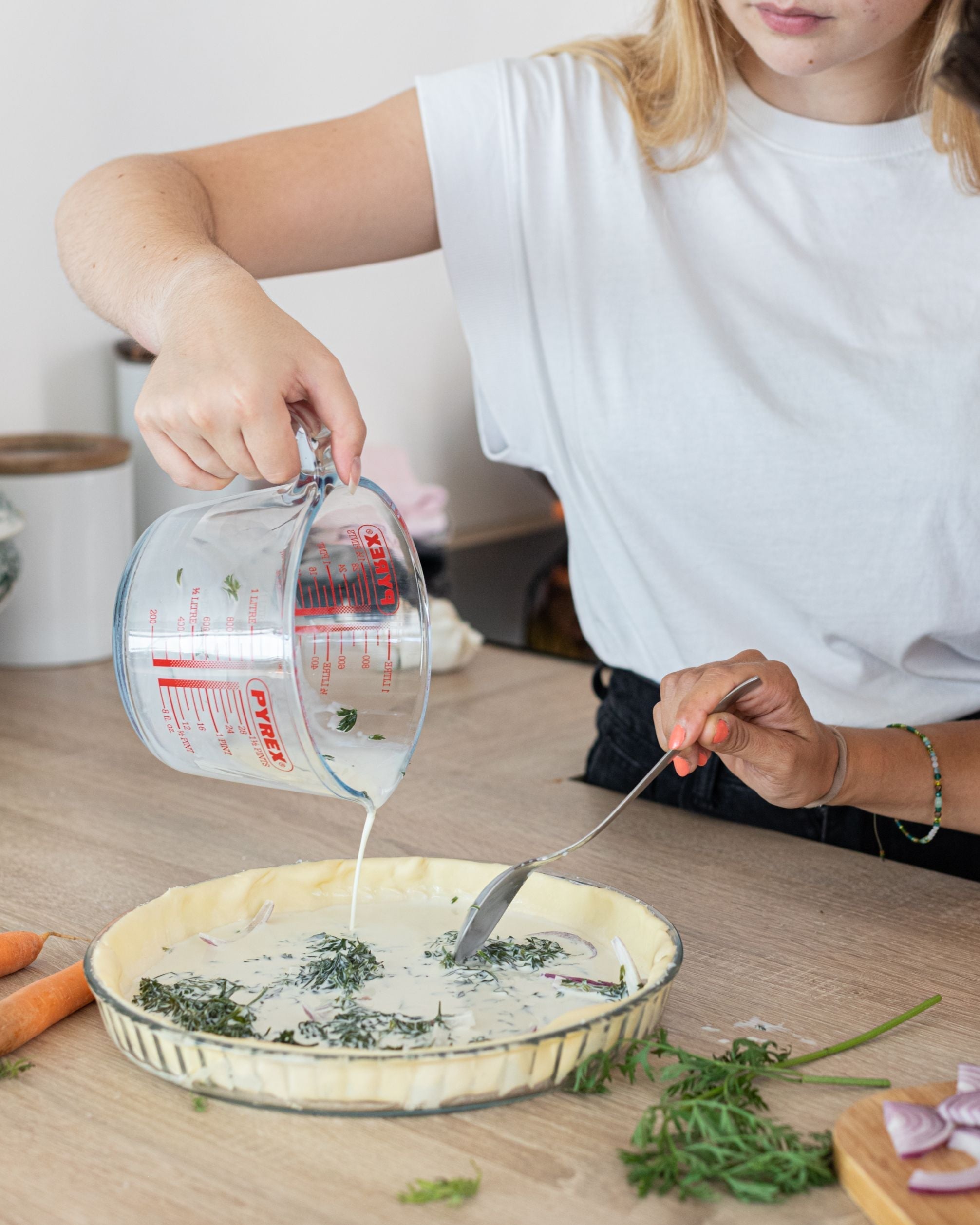 In a bowl, break the eggs, add the cream, salt and pepper. Add the cooked carrot tops and the chopped red onion.