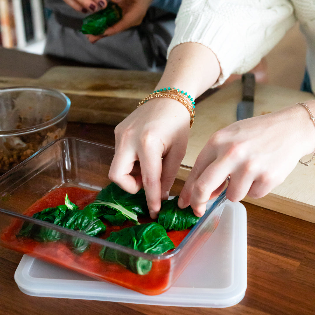 Put a ball of stuffing in the center of the chard leaf. Close it and brush it with oil.