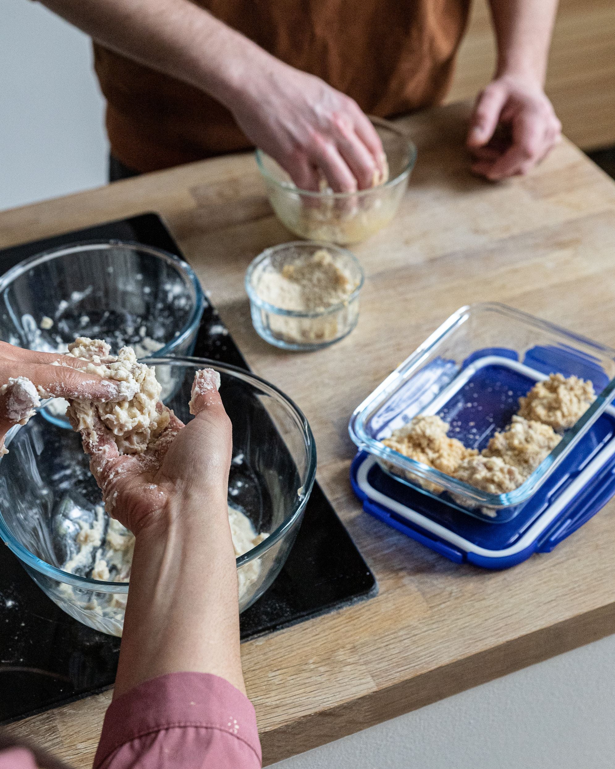At the end of these 2 hours, form balls. On three different plates, place the flour, beaten egg and breadcrumbs. Dip each croquetas in flour, egg then breadcrumbs. Repeat twice.