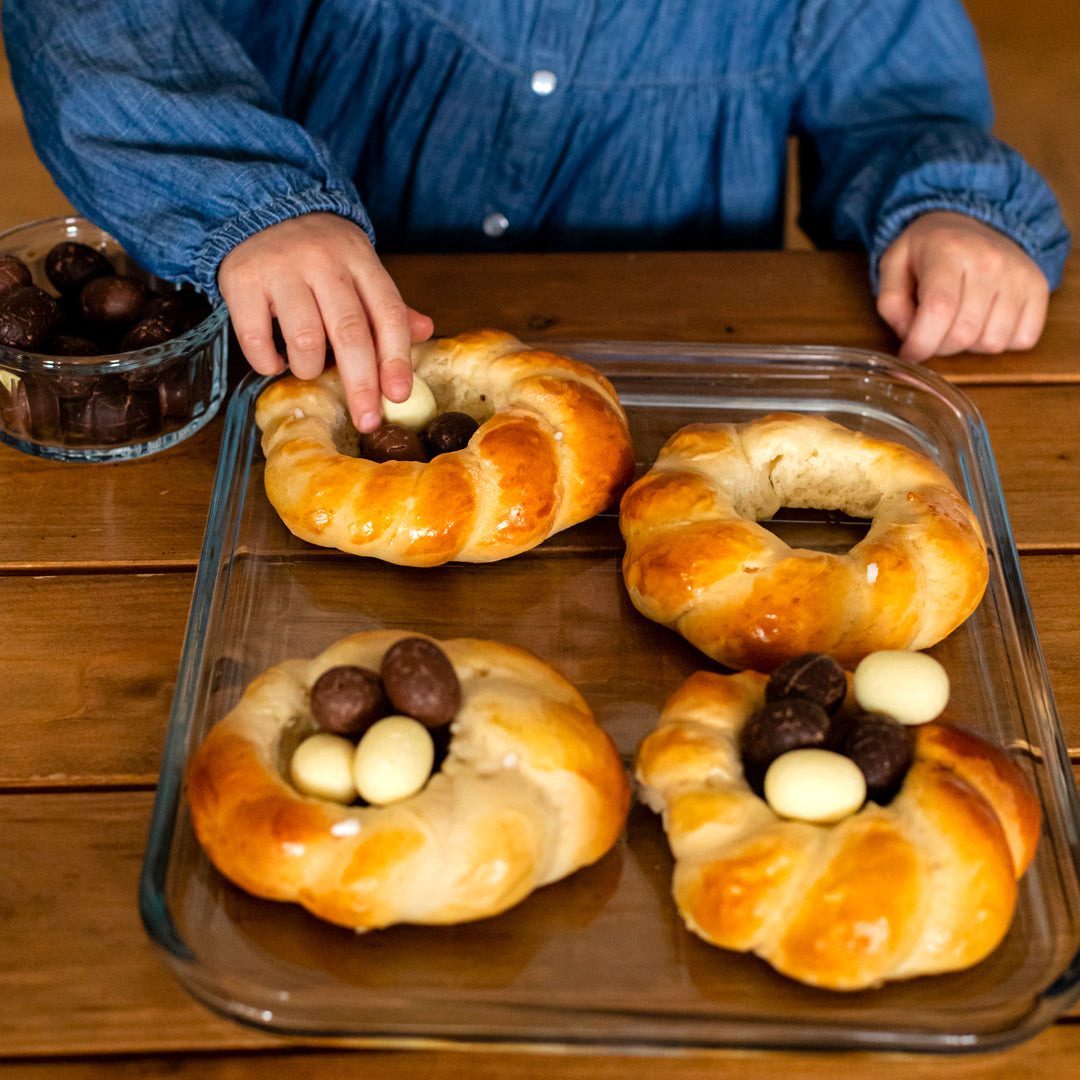 Wait until the brioches are cold before adding chocolate eggs to the center.