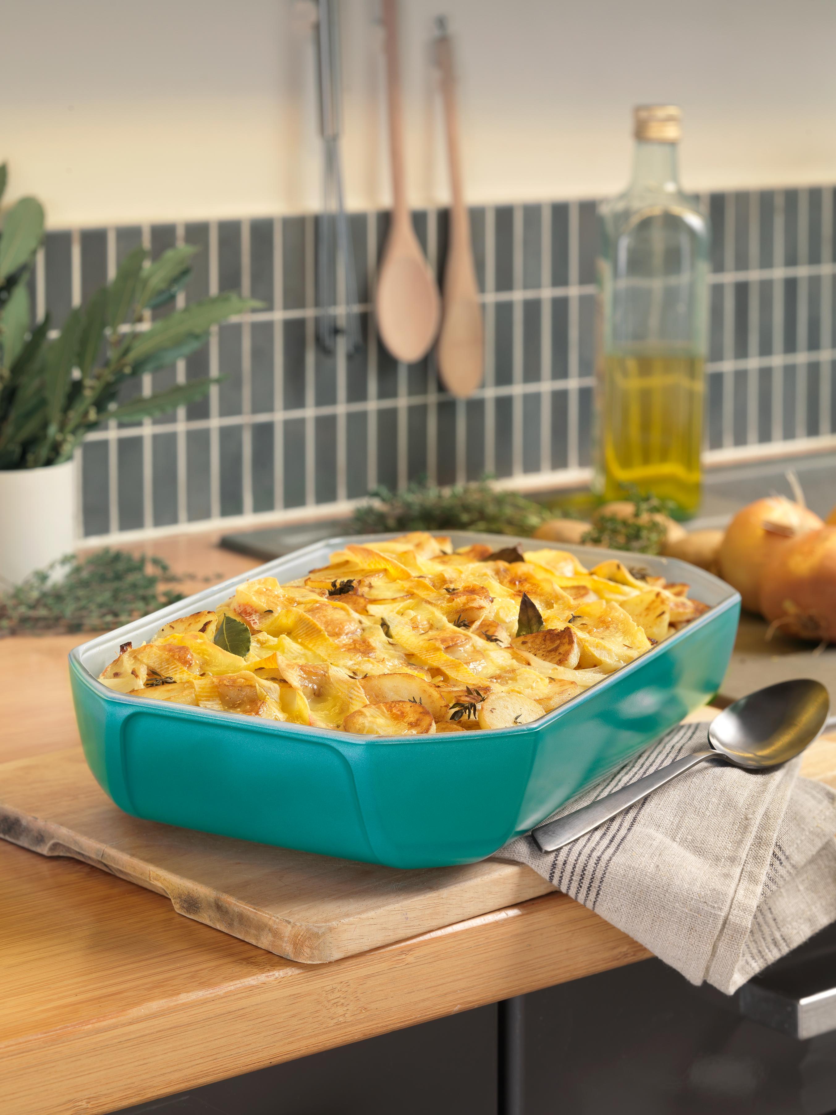 Cut the potatoes into thin slices, do not put them back in water, they must retain their starch which will help bind everything together during cooking.