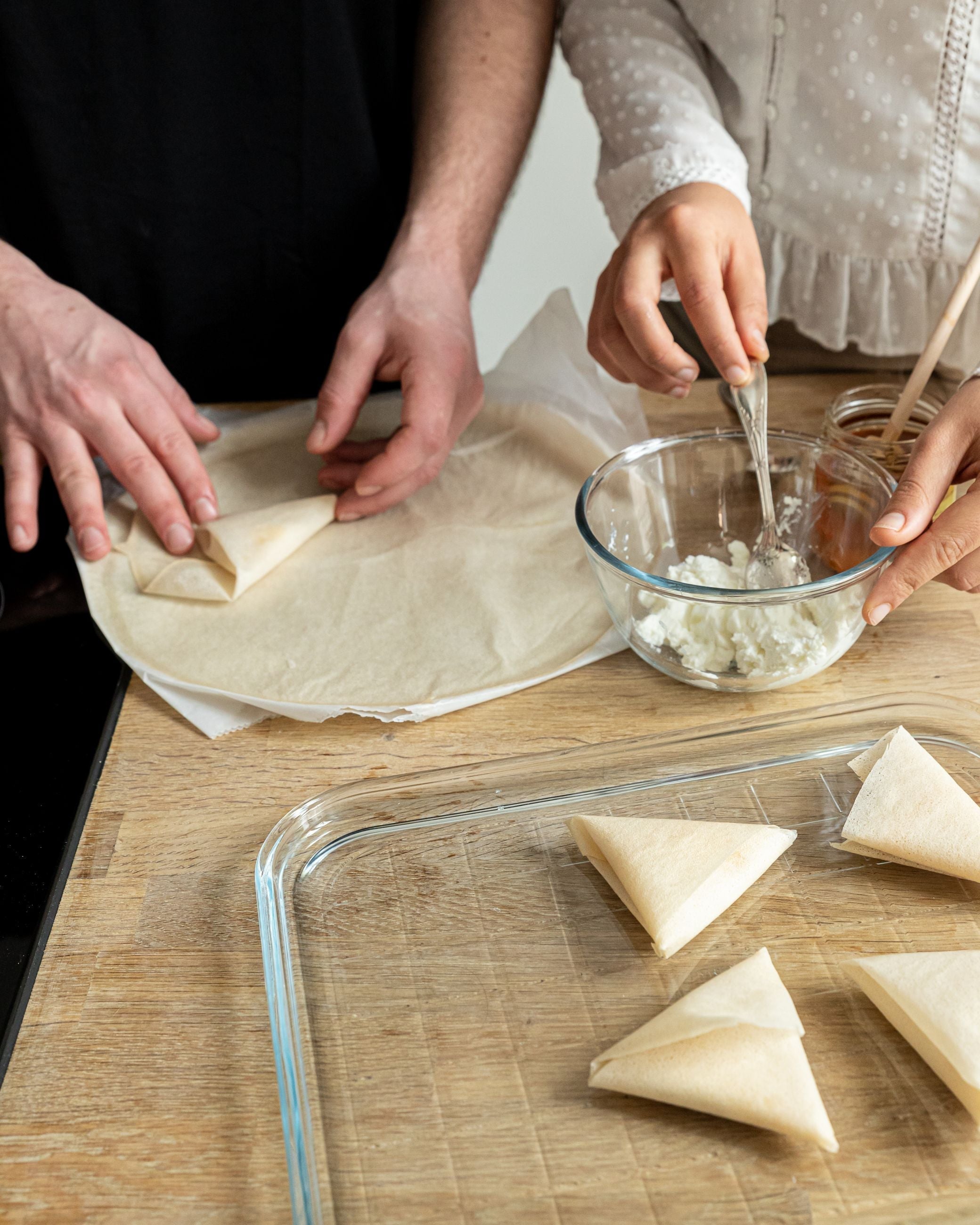 Fold the strip of brick sheet into a triangle, starting from the corner where the goat cheese is located. Close the brick tightly. Make the other bricks until the goat cheese is used up.