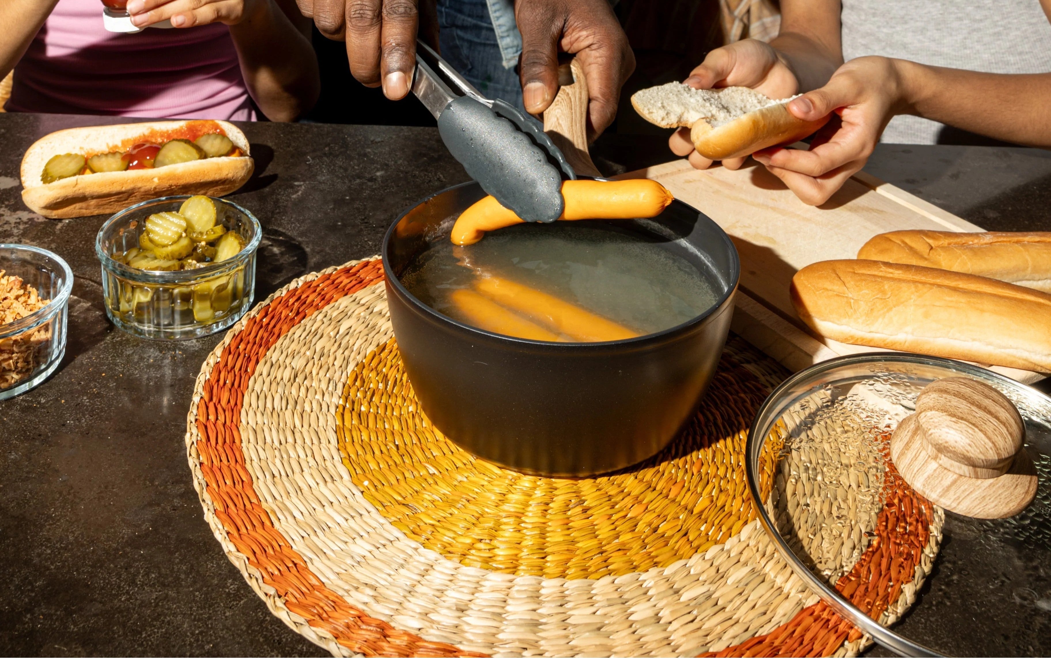 Slice the hot dog buns, but don’t cut them all the way through. Spread mustard, ketchup, or both inside the buns, according to your taste.