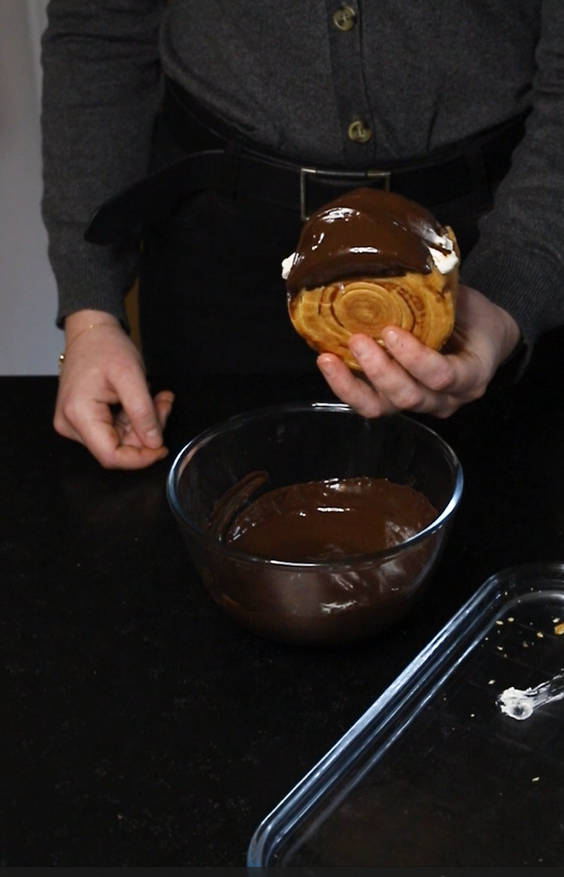 Melt the chocolate, dip the top of the roll and sprinkle with chopped hazelnuts.