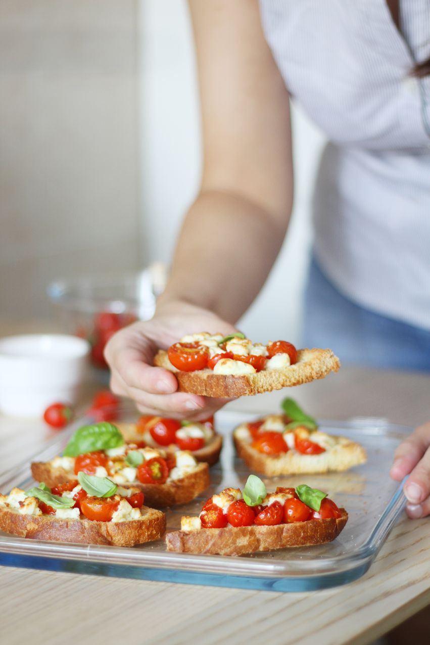 Take the bruschettas out of the oven, spread a little burrata and place the tomato/rocket mixture on top.