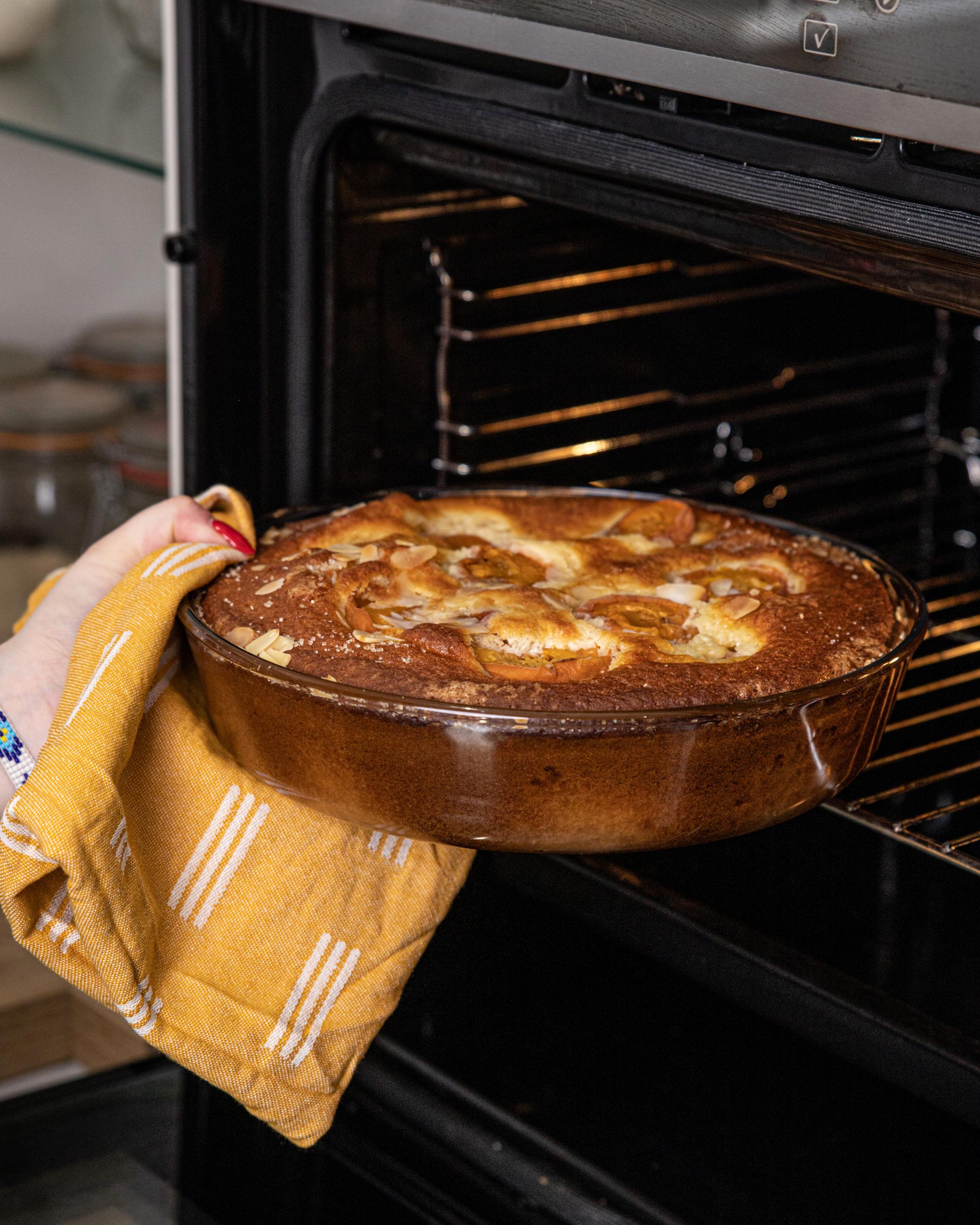 Soft cake: sweet marriage of yogurt, tender flour, sun-kissed apricots, sprinkled with crunchy, golden almonds. Irresistible golden delight!