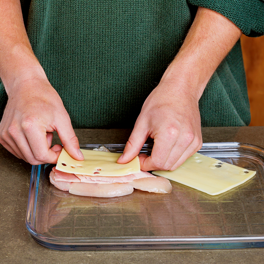 Season with salt and pepper. Place a slice of ham and a slice of cheese on each fillet. Fold the chicken fillets over.