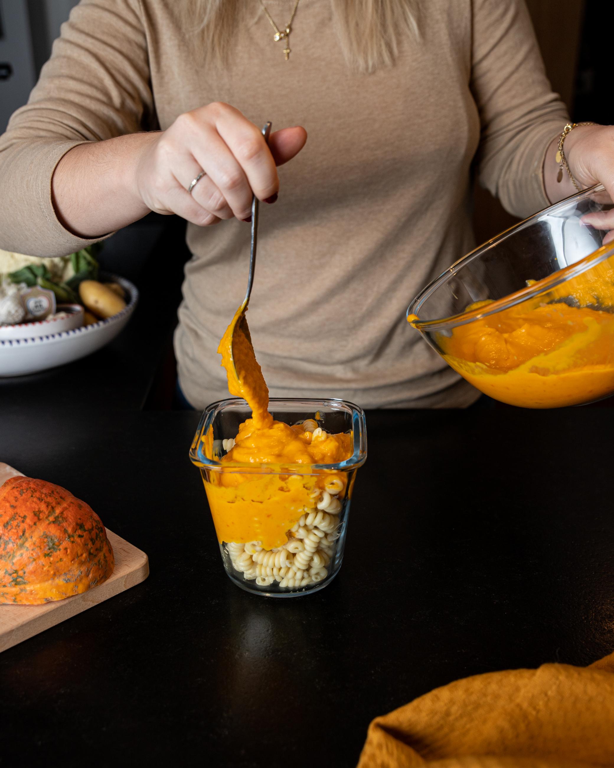 Mix the pasta with the pumpkin sauce, the parmesan and 50 to 100 ml of reserved water to loosen them. Season and sprinkle with additional parmesan.