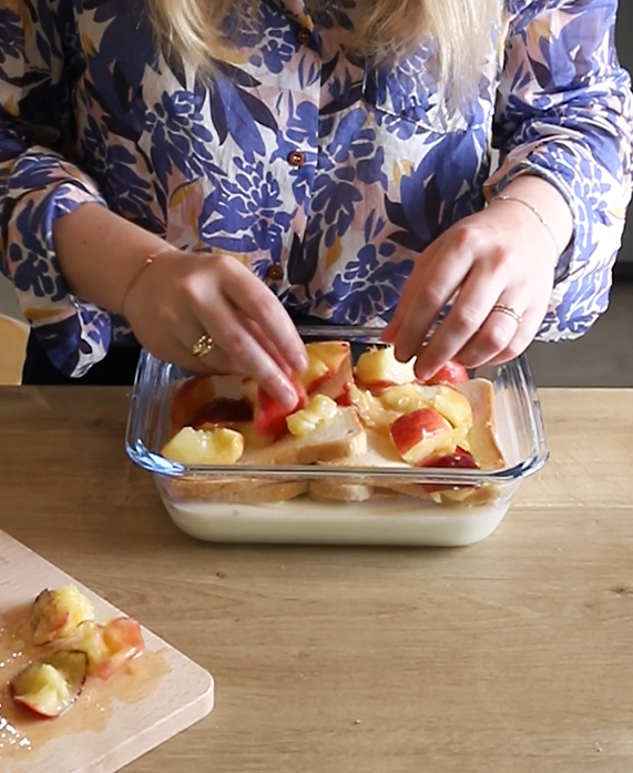 Arrange the slices of stale bread in the baking dish. Pour the mixture on top.
