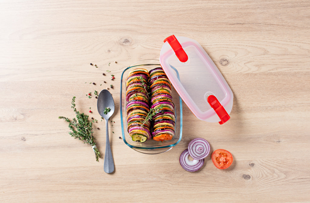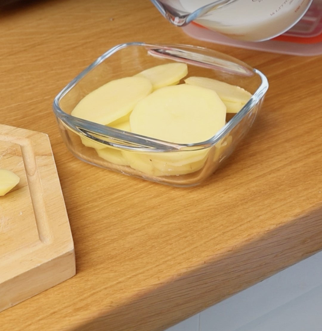 Once the milk is hot, arrange the potato slices in the dish, press them down with a fork, and microwave for 10 minutes.