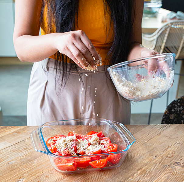 A Provencal treat: juicy tomatoes, flavored with herbs, crowned with a crispy parmesan crumble. An explosion of flavors!