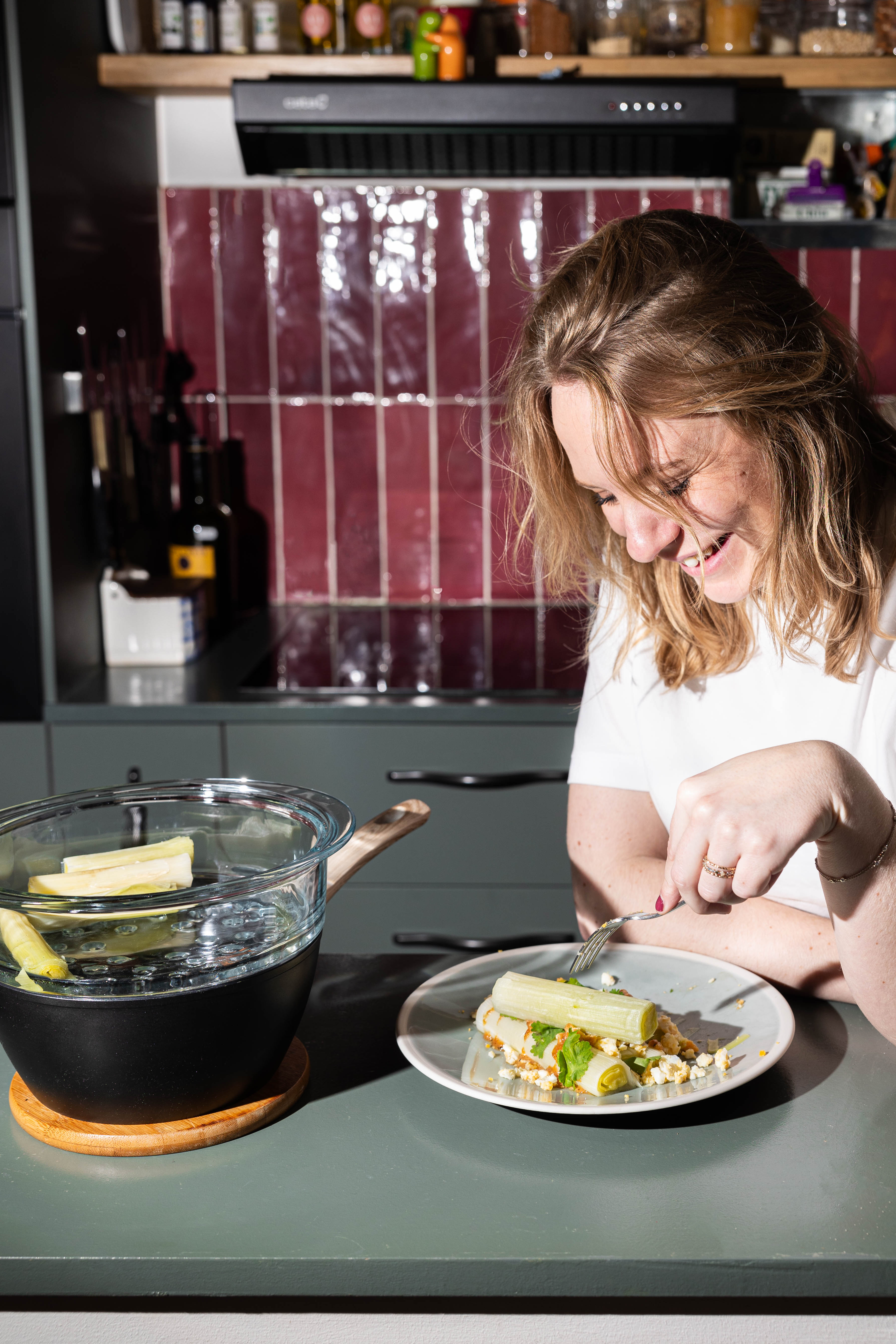 Arrange the leeks on a plate. Crumble the eggs on top and add the miso sauce.