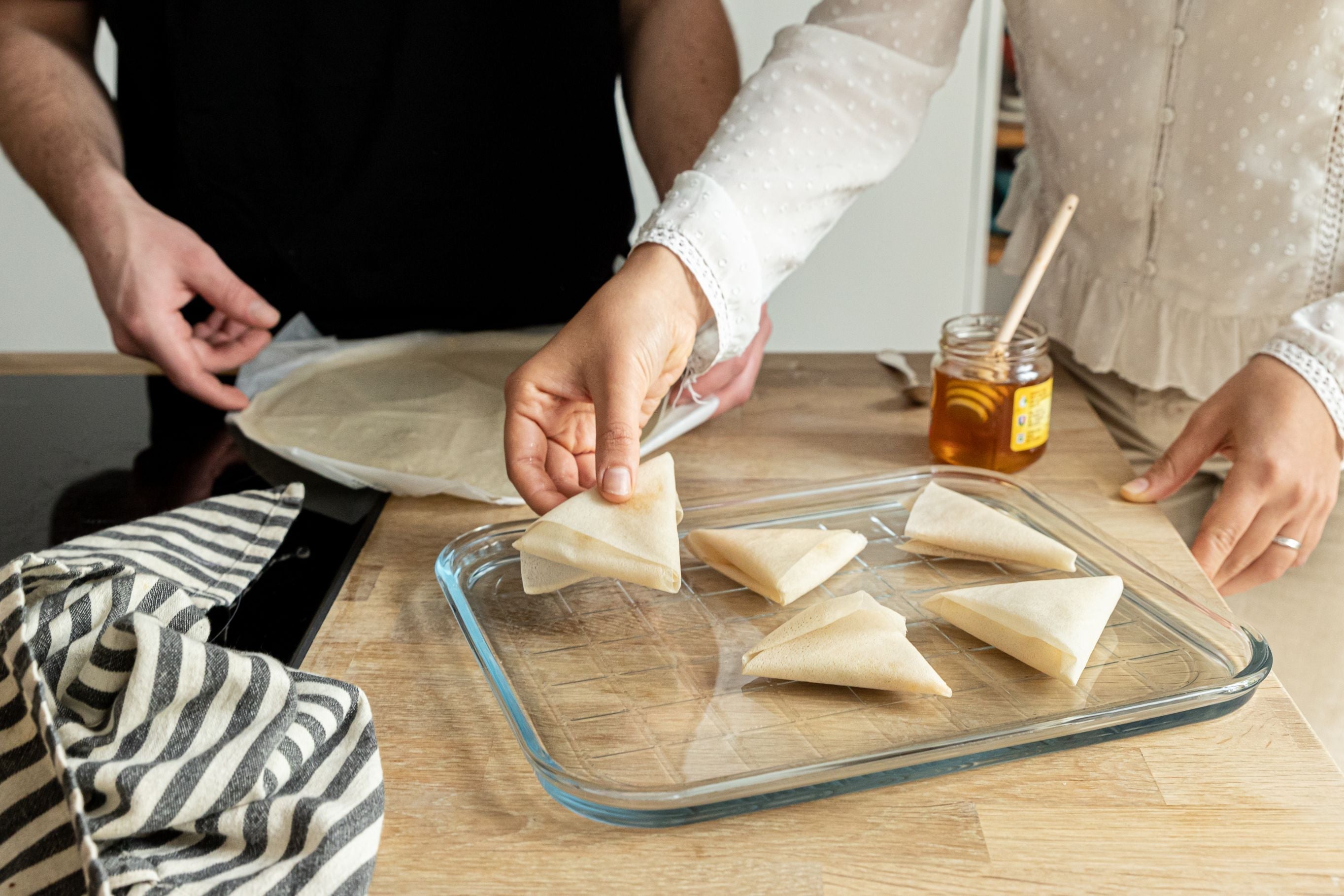 Remove the circles from the baking sheet while they are still warm, add a small piece of paper with a quote or your own witty message. Fold it circle in half. Form the characteristic fortune cookie shape with the rim of a glass.